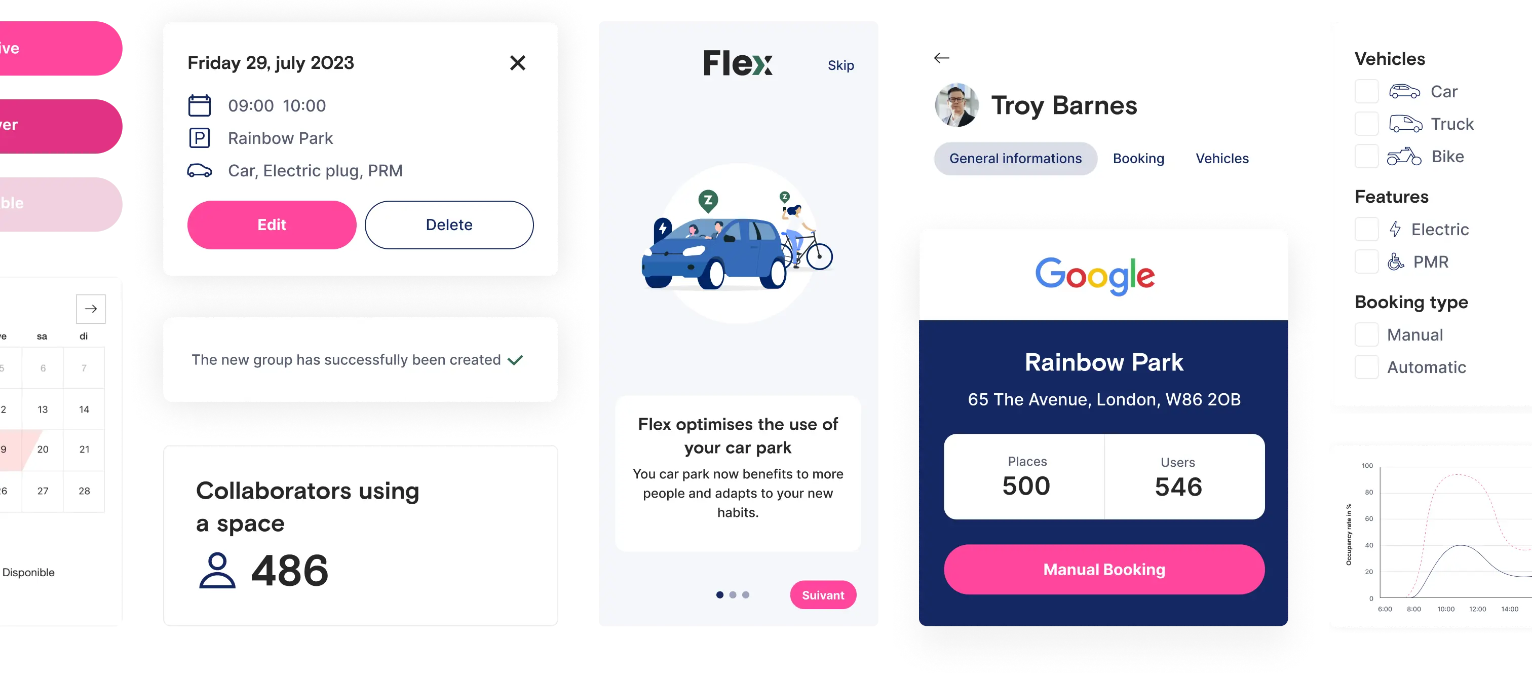 I was tasked to design “Flex”, a new product that facilitates employees daily mobility and helps park managers to optimise the usage and safety of companies car parks.