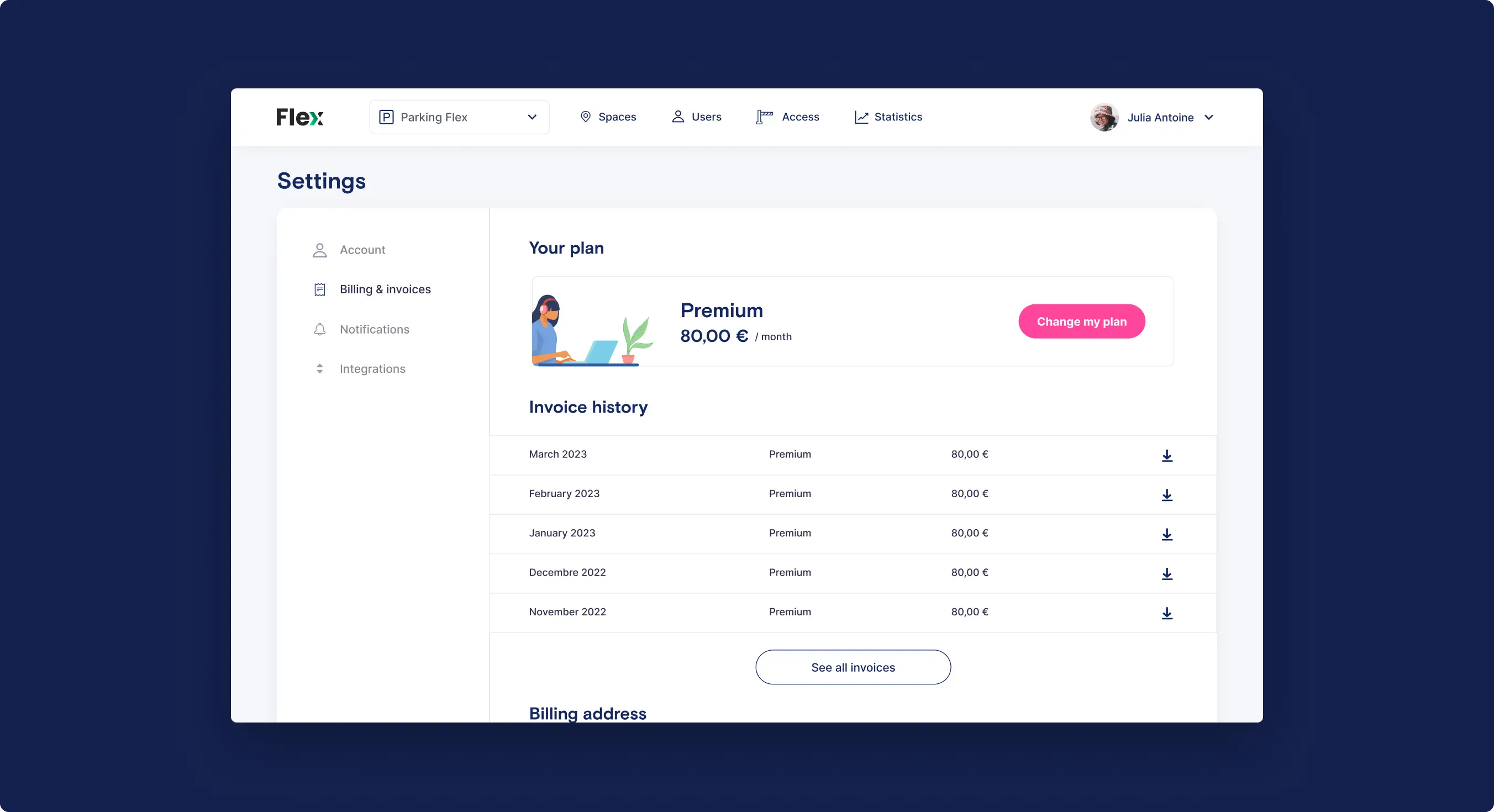 Employees update their parking needs from their Flex mobile app or free up a space that has been allocated to them. They will get a phone and email notification to confirm their booking. The app can be used as an ID to enter the car park, thus limiting potential safety issues (lost badges, unregulated shared access, no possibility to assign places, etc).